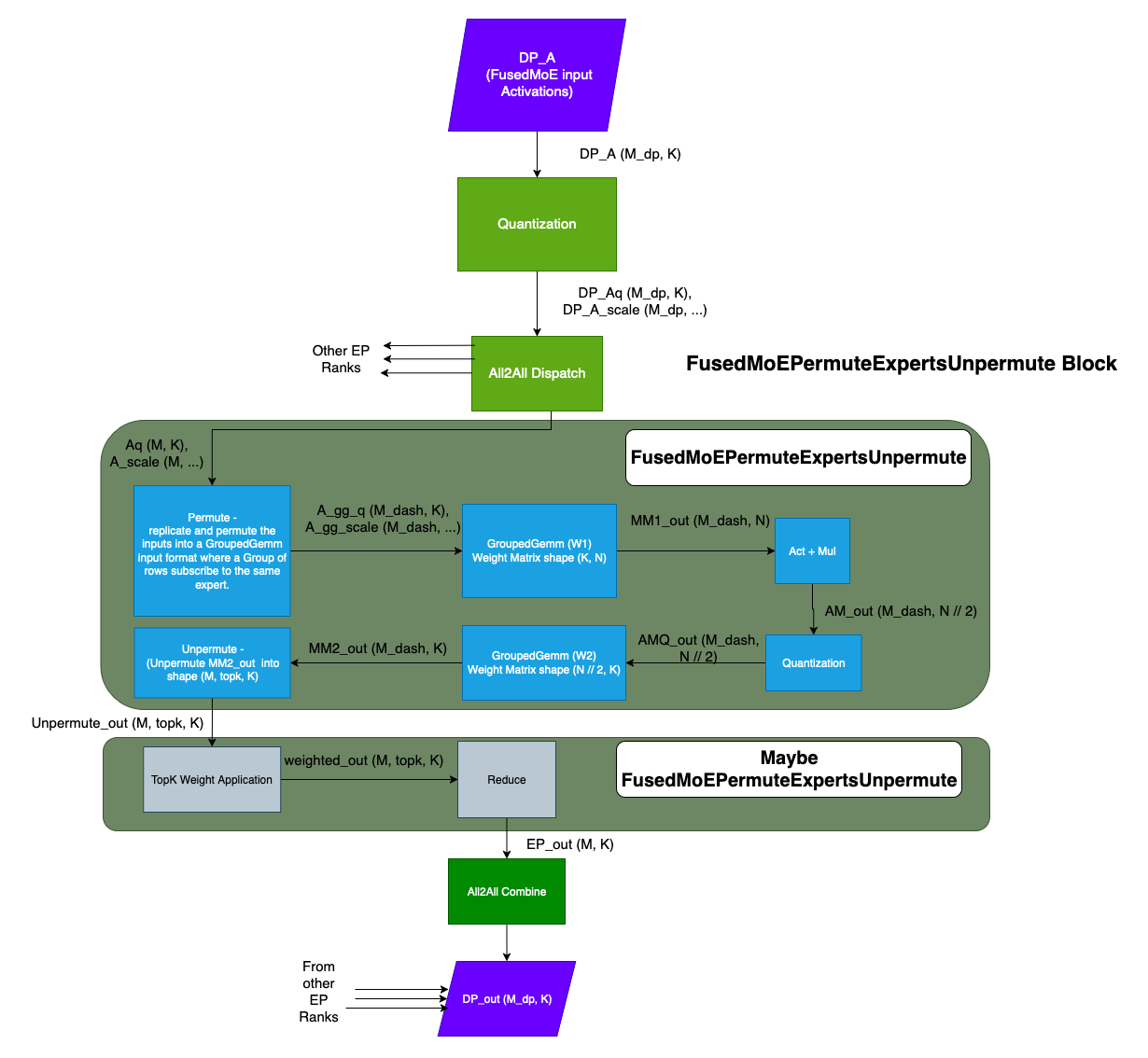 FusedMoEModularKernel is composed of the FusedMoEPrepareAndFinalize and FusedMoEPermuteExpertsUnpermute objects. FusedMoEModularKernel pseudocode/sketch,